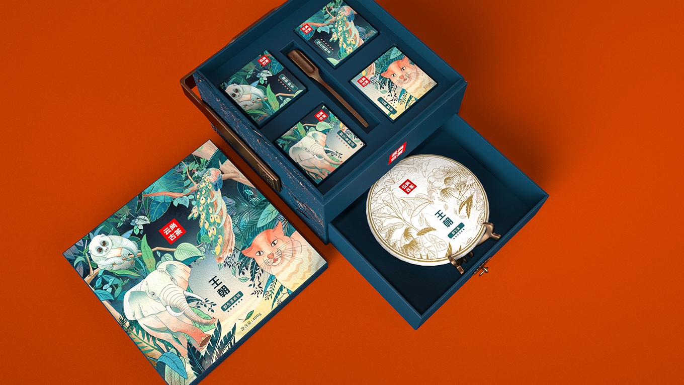 古茶因?yàn)樯L在原始森林,所以生長環(huán)境較為苛刻,產(chǎn)量更為稀缺。產(chǎn)品的稀缺,可以用相應(yīng)的和古茶共生的保護(hù)動(dòng)物來表現(xiàn)。所以我們選擇了用綠孔雀、野生象、懶猴、云貓這些有代表性的云南珍稀保護(hù)動(dòng)物進(jìn)行包裝主畫面設(shè)計(jì)。用原生態(tài)的自然元素表現(xiàn)出在原始森林中珍稀野生動(dòng)物與古茶共生的畫面。在一片綠色的原始森林中,有活力的原始動(dòng)物、靜謐生長的古茶,交相映襯,使得整個(gè)畫面安靜又具活力。而且這樣的設(shè)計(jì)不僅可以讓人從生態(tài)環(huán)境角度感受到產(chǎn)品的品質(zhì),也可以體現(xiàn)出云尚古茶的獨(dú)特和珍貴之處。讓人回味無窮。
